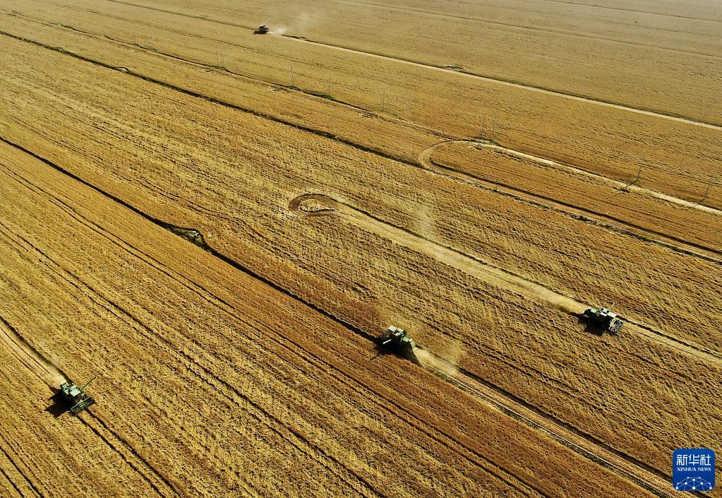 在河南省周口市黄泛区农场九分场的麦田里,农机手操作收割机收获小麦(6月6日摄,无人机照片)。黄泛区,过去是灾难的代名词。黄泛区农场自1951年1月成立70年来,在一代代农场人的不懈努力下,从“一杯茶水半杯泥”的贫瘠之地,变成全国现代农业的示范区;从黄水泛滥的“中原沙漠”,变成麦浪滚滚、机声隆隆的“农垦巨人”。