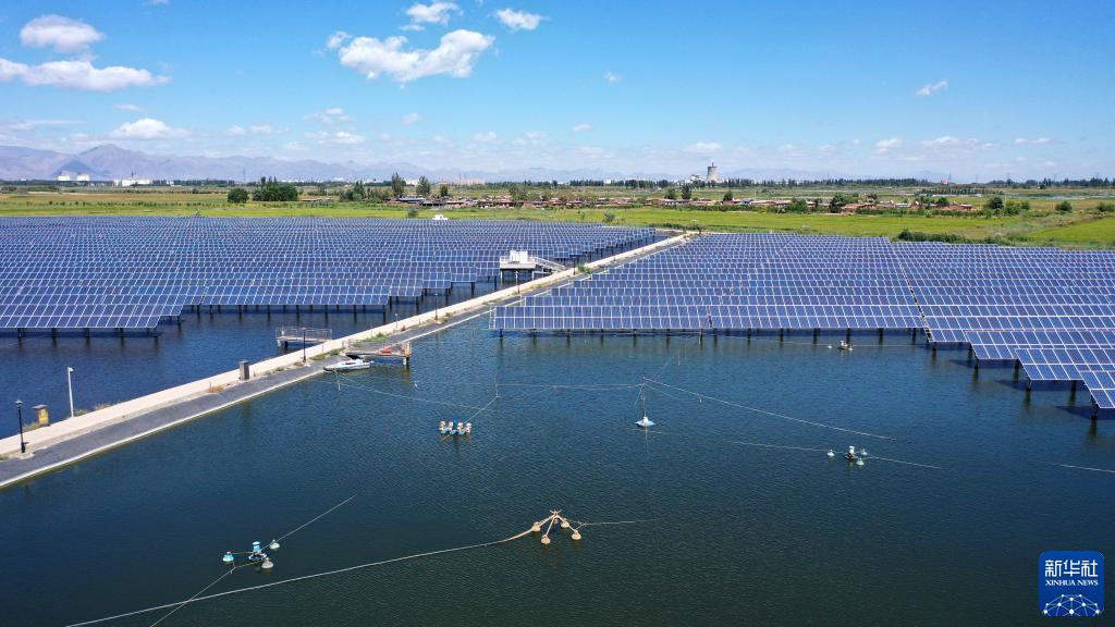 宁夏银川市贺兰县渔业公园内的光伏养鱼基地(8月24日摄,无人机照片)。当地以适水产业为依托,探索园区封闭式农业水资源循环利用模式,在生态建设和绿色渔业发展之间寻求科学平衡发展之路。