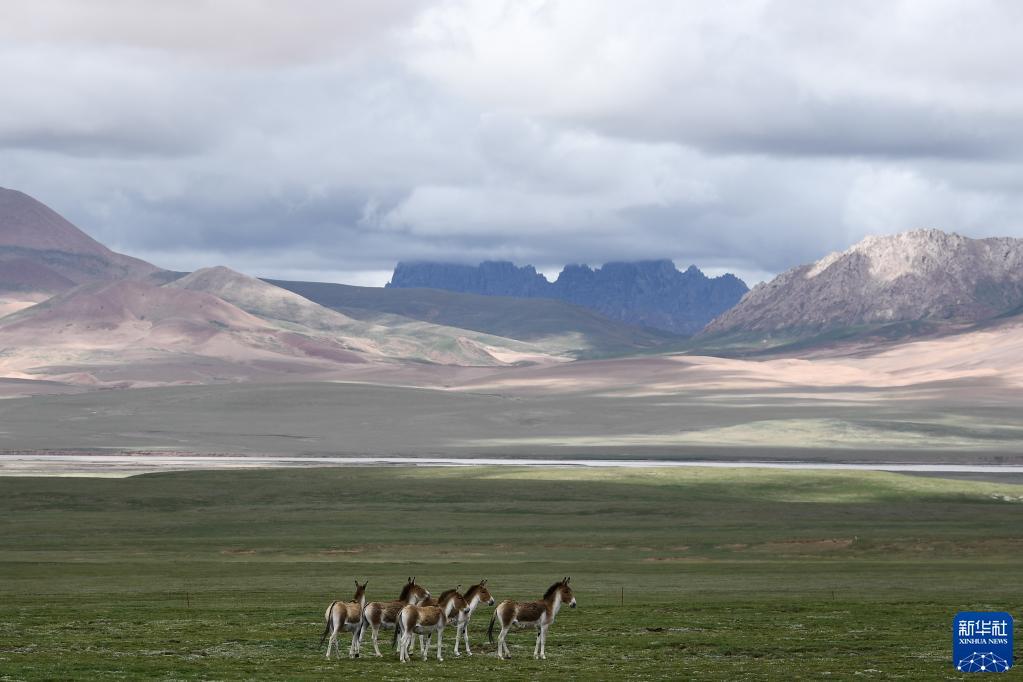 在三江源地区,一群藏野驴在草原上活动(7月25日摄)。