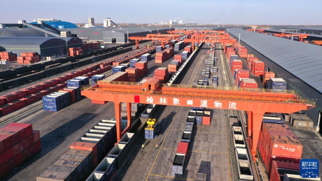 在陕西榆林象道国际物流园集装箱装卸区,工作人员在指挥装卸外运煤炭(2020年10月31日,无人机照片)。该物流园拓宽了陕北能源基地的货物运输渠道,有效破解煤炭外运瓶颈问题,打通了优质煤炭、高端能化、现代农业、先进制造等产业链条。