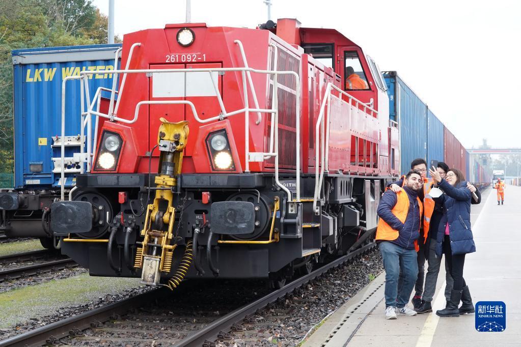 10月26日,在德国汉堡,中德铁路工作人员与首列“上海号”中欧班列合影。
