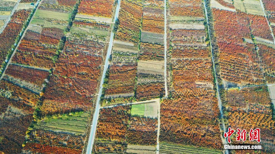 俯瞰万亩杏园,金黄色、红色的杏园和菜田纵横交织,好似一个调色板,浓浓秋意正演绎万亩杏园的多彩之秋。漫步杏园,大片的金黄色杏林尽收眼底,中间还夹杂着星星般的红点。杏树叶已经泛红或者泛黄,一阵清风将树叶吹落满地,画面醉人。