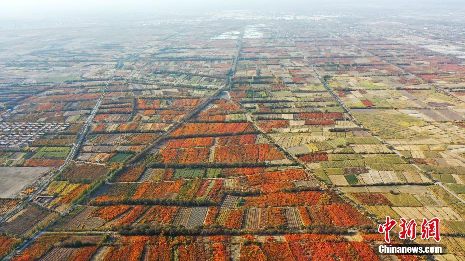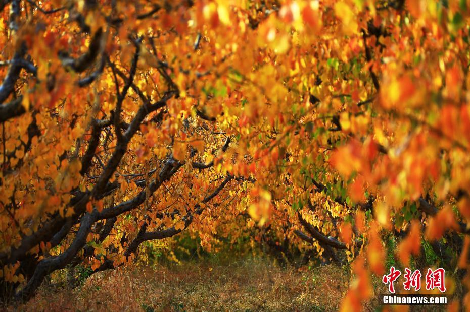 时值深秋,新疆托克逊县夏镇南湖村的万亩杏园内,金黄色的杏树叶在枝头摇摇欲坠,浓浓秋意覆盖万亩杏园。