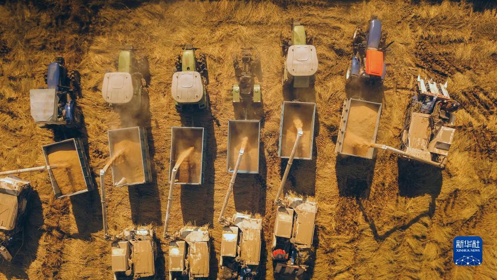 10月20日,在辽宁省铁岭市铁岭县新台子镇西三家子村,万鑫水稻种植专业合作社把机械化收割下来的水稻装车(无人机照片)。