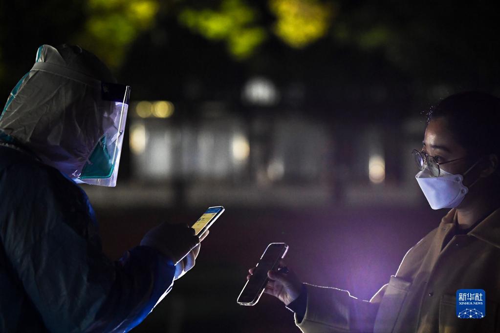 10月23日,在宁夏银川市金凤区北京中路街道采样点,医务人员(左)在扫码登记居民信息。