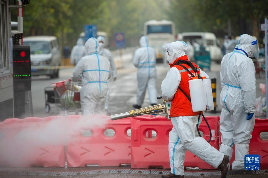 10月25日,在北京北七家镇宏福苑社区北门,疫情防控人员在进行消杀。