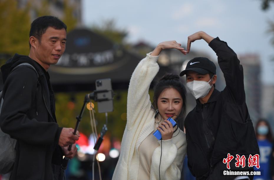 11月3日,一名主播在湖滨路步行街直播跳舞。浙江杭州西湖边的湖滨路步行街自开街以来,随着人气不断增加,越来越多的网络主播选择在步行街进行户外直播。 中新社记者 王刚 摄