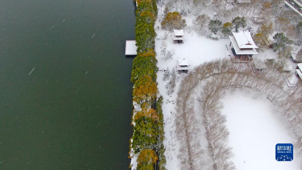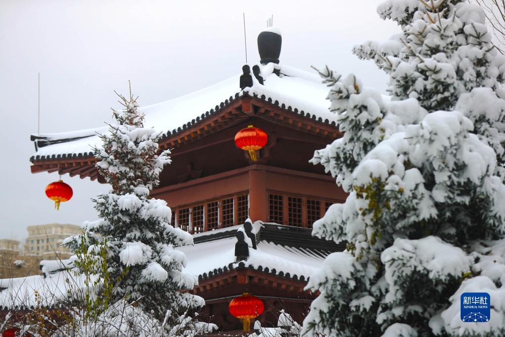 11月9日拍摄的浑河岸边沈水湾公园内的云飏阁雪景(无人机照片)。