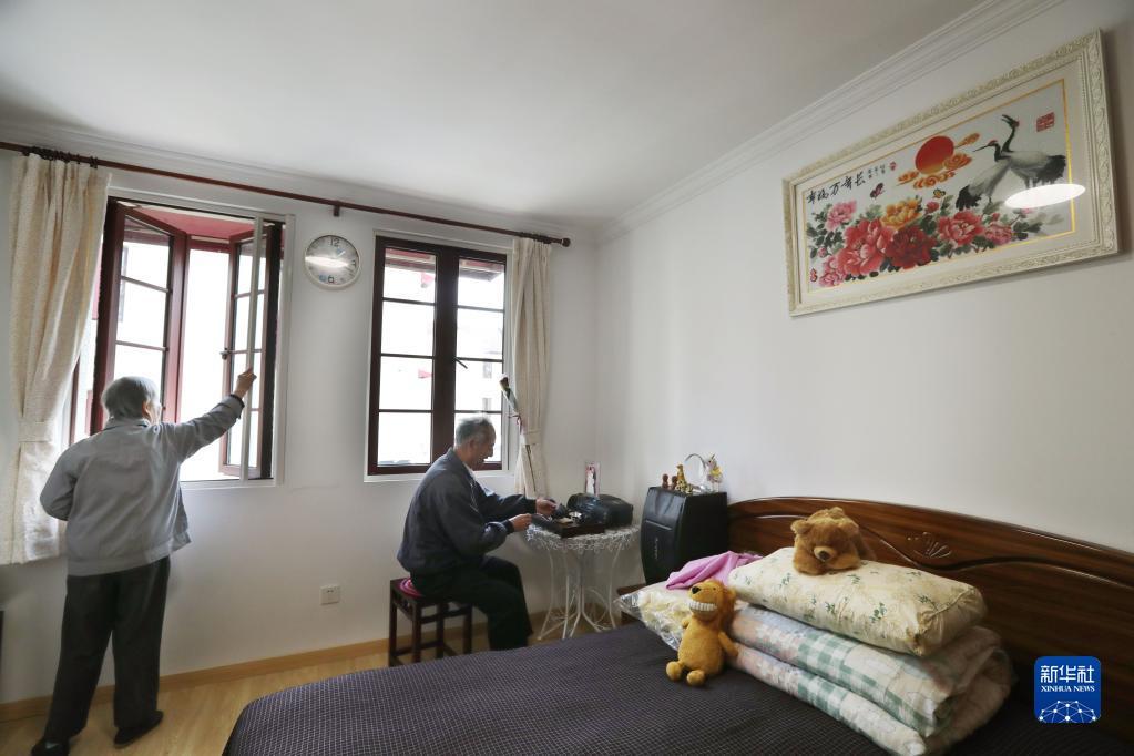 11月23日,曹杨一村居民高林林(左)与丈夫唐新华在自家卧室内。1952年,高林林随父母搬入曹杨一村,居住至今。