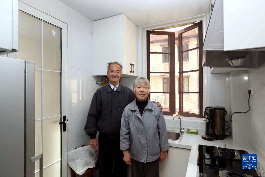 11月23日,曹杨一村居民、73岁的高林林(右)与丈夫唐新华在刚回搬的新居内。新华社记者 刘颖 摄