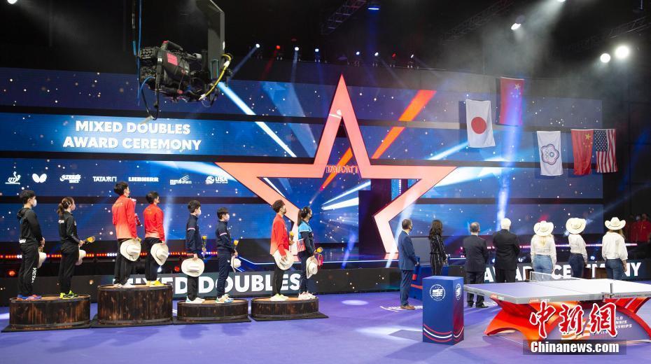 当地时间11月28日,王楚钦(左三)和孙颖莎(左四)参加休斯敦世乒赛混双项目的颁奖仪式。当日,在美国休斯敦举行的2021世界乒乓球锦标赛混合双打决赛中,中国组合王楚钦/孙颖莎战胜日本组合张本智和/早田希娜,夺得冠军。 中新社记者 刘关关 摄