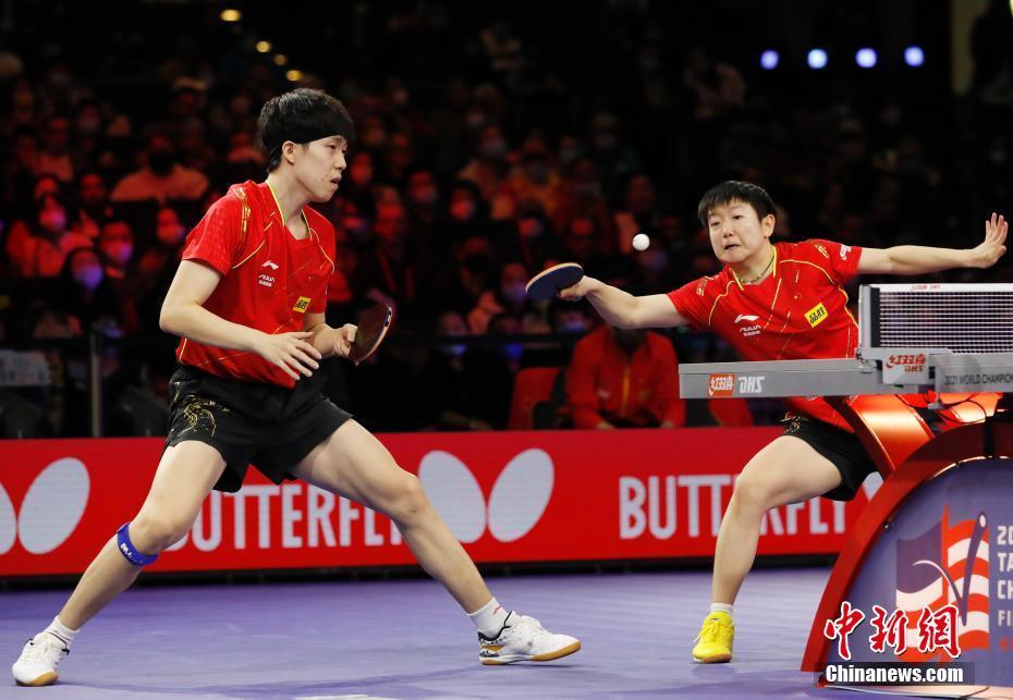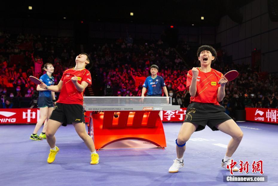 当地时间11月28日,王楚钦(左)和孙颖莎在比赛中。当日,在美国休斯敦举行的2021世界乒乓球锦标赛混合双打决赛中,中国组合王楚钦/孙颖莎战胜日本组合张本智和/早田希娜,夺得冠军。 中新社记者 刘关关 摄