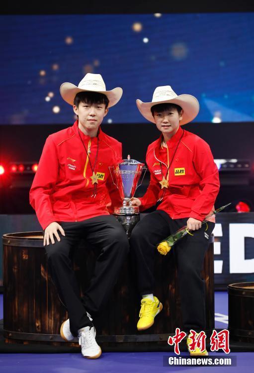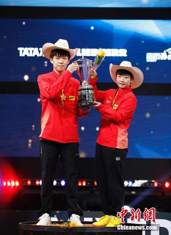 当地时间11月28日,王楚钦(左)和孙颖莎手捧奖杯拍照。当日,在美国休斯敦举行的2021世界乒乓球锦标赛混合双打决赛中,中国组合王楚钦/孙颖莎战胜日本组合张本智和/早田希娜,夺得冠军。 中新社记者 刘关关 摄