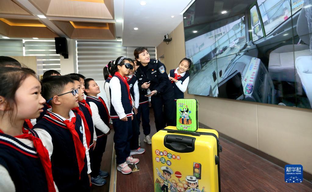 12月1日,上海市公安局徐汇分局交警支队民警张晓晨在徐汇区逸夫小学指导小学生通过VR设备体验“大货车盲区”。