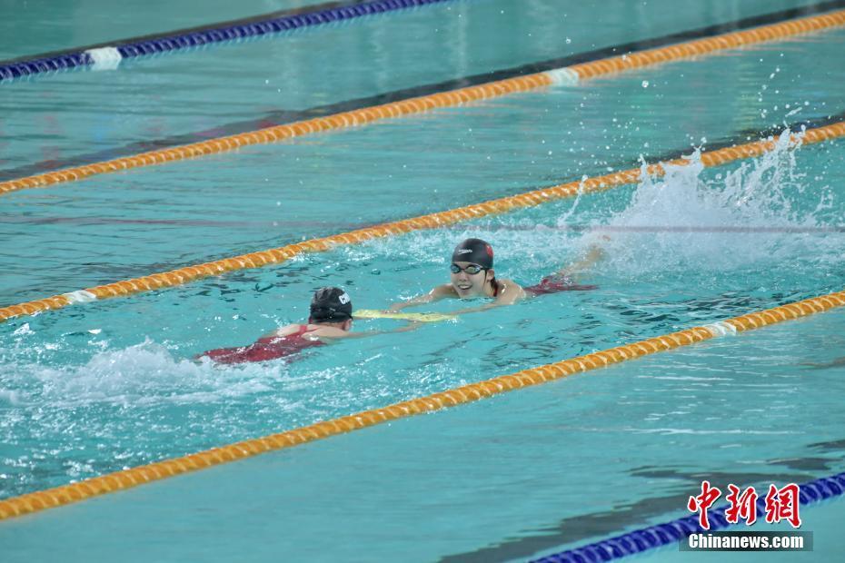 12月4日上午,内地奥运健儿代表团的部分运动员来到香港铜锣湾维多利亚公园游泳池,向现场观众示范表演跳水及游泳运动,展示奥运健儿风采。图为游泳运动员杨浚瑄、汤慕涵进行游泳表演。中新社记者 李志华 摄