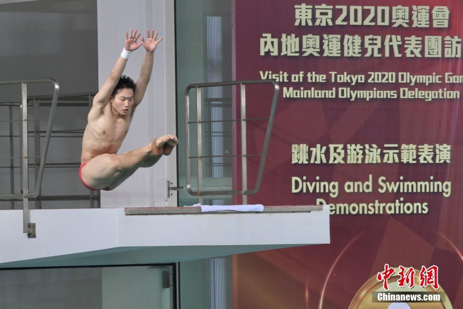 12月4日上午,内地奥运健儿代表团的部分运动员来到香港铜锣湾维多利亚公园游泳池,向现场观众示范表演跳水及游泳运动,展示奥运健儿风采。图为跳水运动员王宗源进行跳水示范及表演。中新社记者 李志华 摄