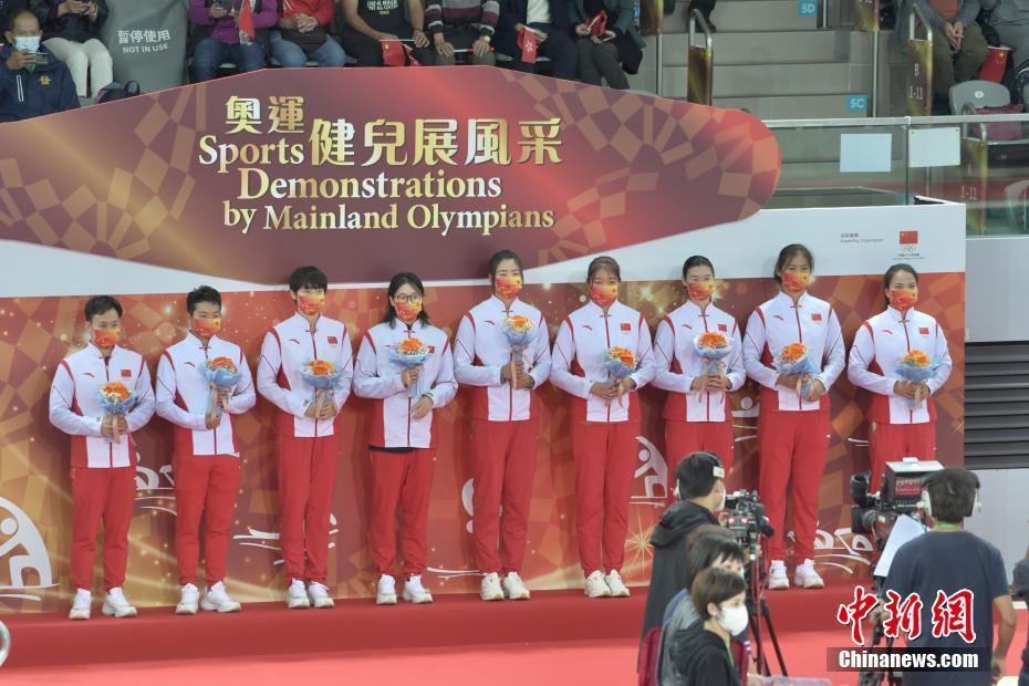 12月4日上午,内地奥运健儿代表团的部分运动员来到香港铜锣湾维多利亚公园游泳池,向现场观众示范表演跳水及游泳运动,展示奥运健儿风采。图为内地奥运健儿出席活动仪式。中新社记者 李志华 摄