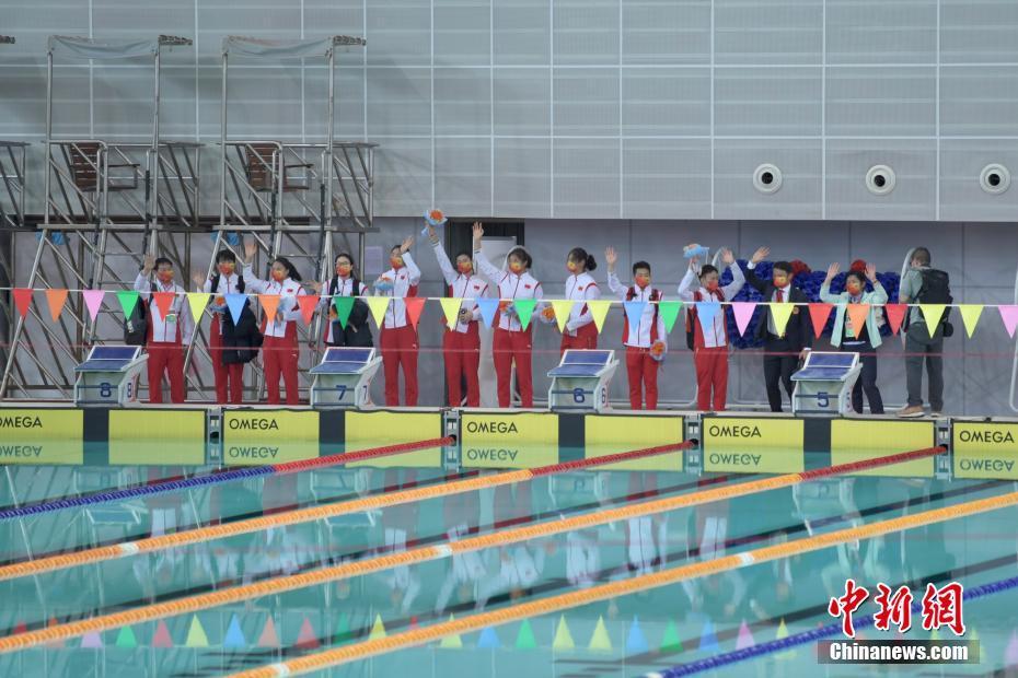 12月4日上午,内地奥运健儿代表团的部分运动员来到香港铜锣湾维多利亚公园游泳池,向现场观众示范表演跳水及游泳运动,展示奥运健儿风采。图为内地奥运健儿向现场观众挥手。中新社记者 李志华 摄