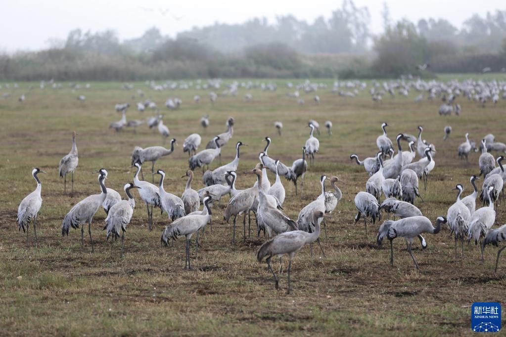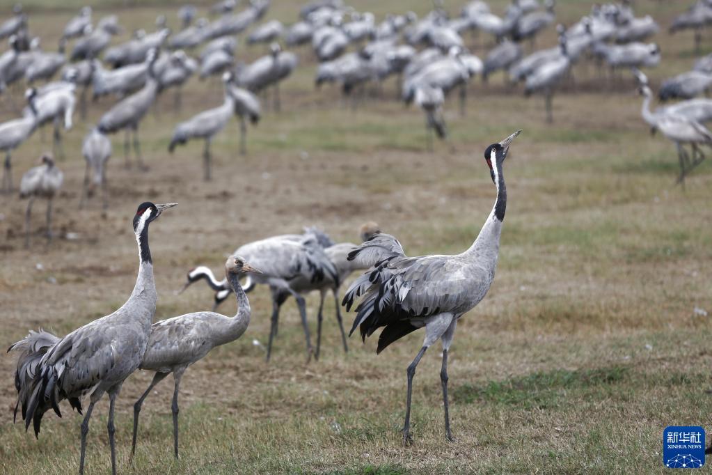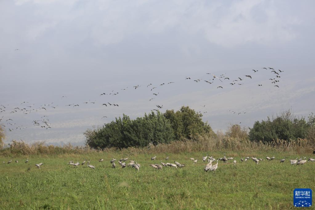 12月9日,一群灰鹤在以色列阿格蒙胡拉鸟类和自然公园的湿地里休息。