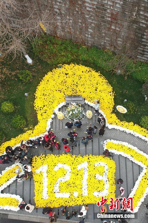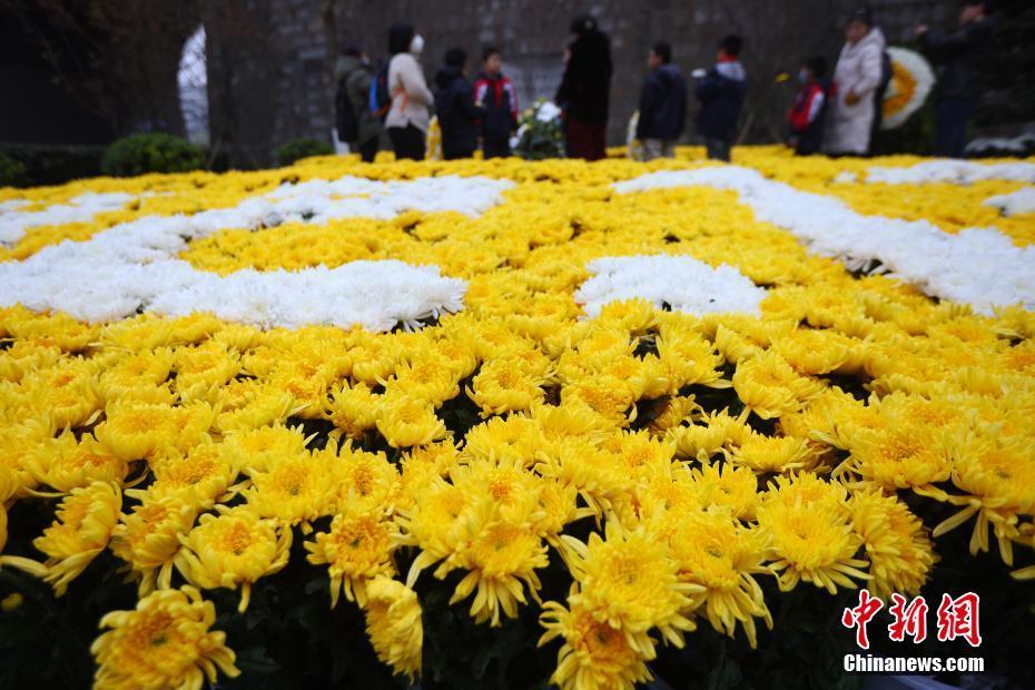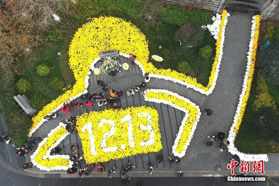 图为侵华日军南京大屠杀遇难同胞正觉寺丛葬地,菊花组成了“1213”字样。(无人机照片) 中新社记者 泱波 摄