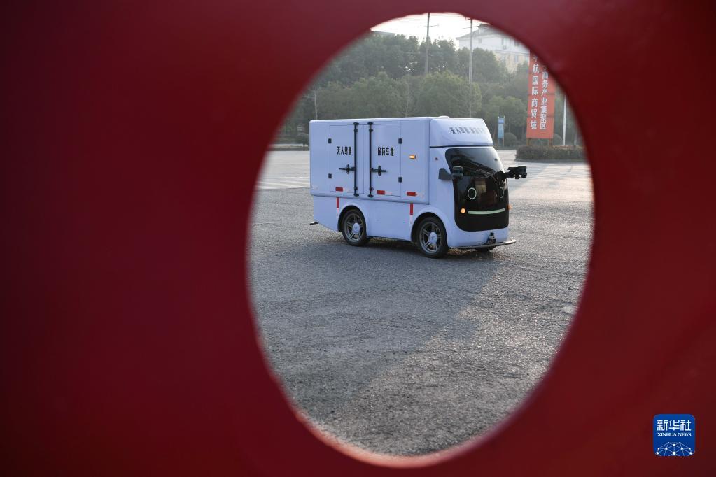 12月10日,在安徽省芜湖市南陵县,一款快递配送无人车在测试中。