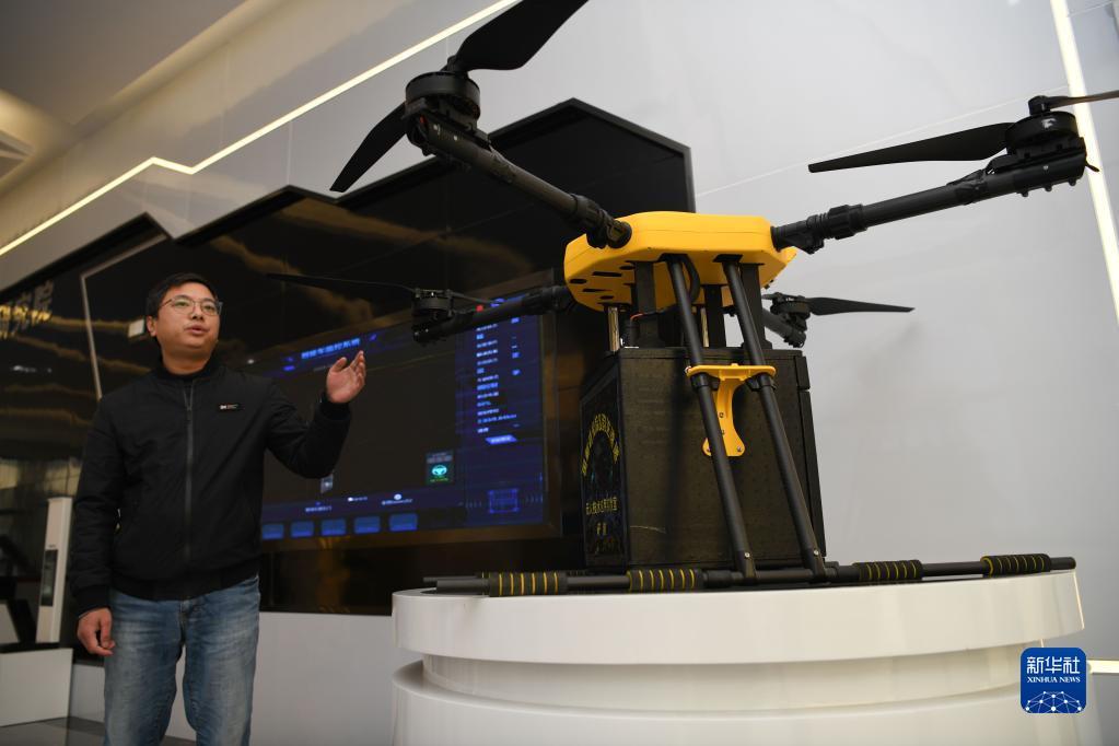 在国邮快递物流智能装备(南陵)产业技术研究院内,工作人员在介绍一款快递配送无人机(12月10日摄)。