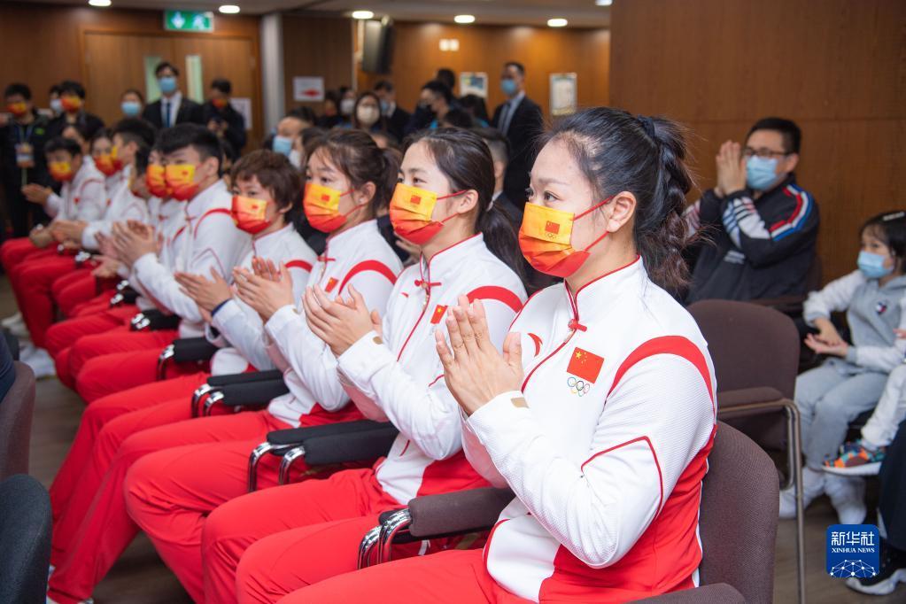 12月21日,内地奥运健儿代表团成员在澳门街坊联合总会石排湾家庭及社区综合服务中心观看表演。
