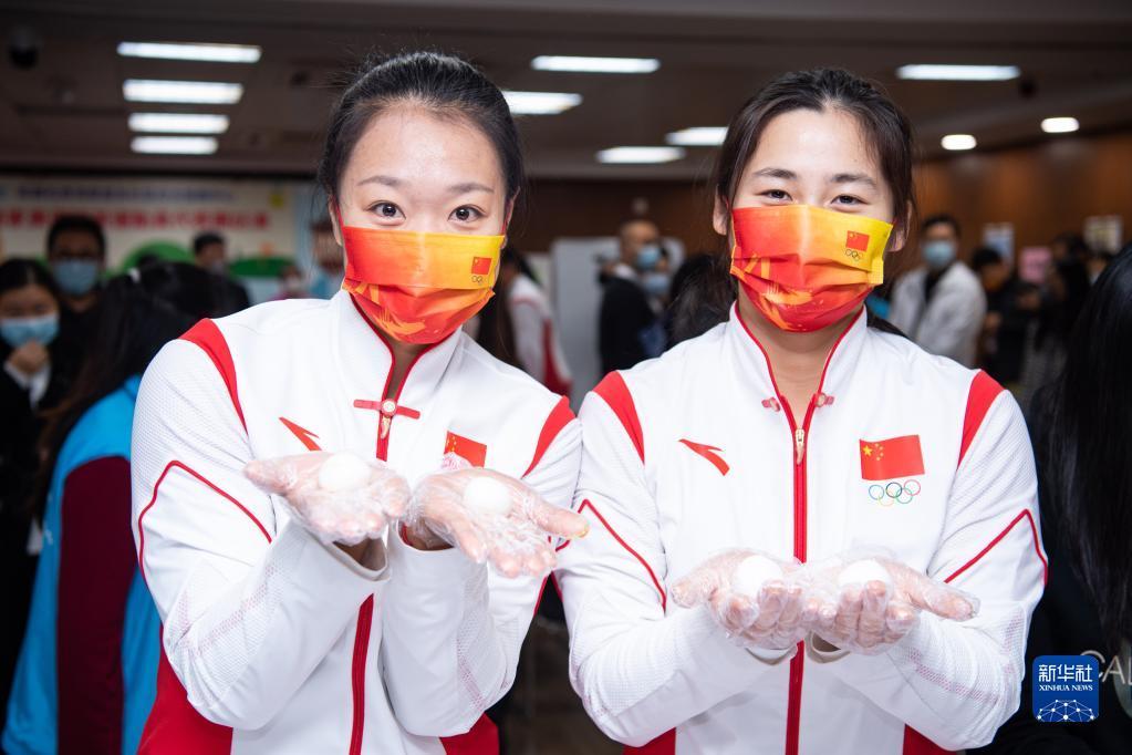 12月21日,在澳门街坊联合总会石排湾家庭及社区综合服务中心,内地奥运健儿代表团成员刘诗颖(左)和孙梦雅展示制作好的汤圆。