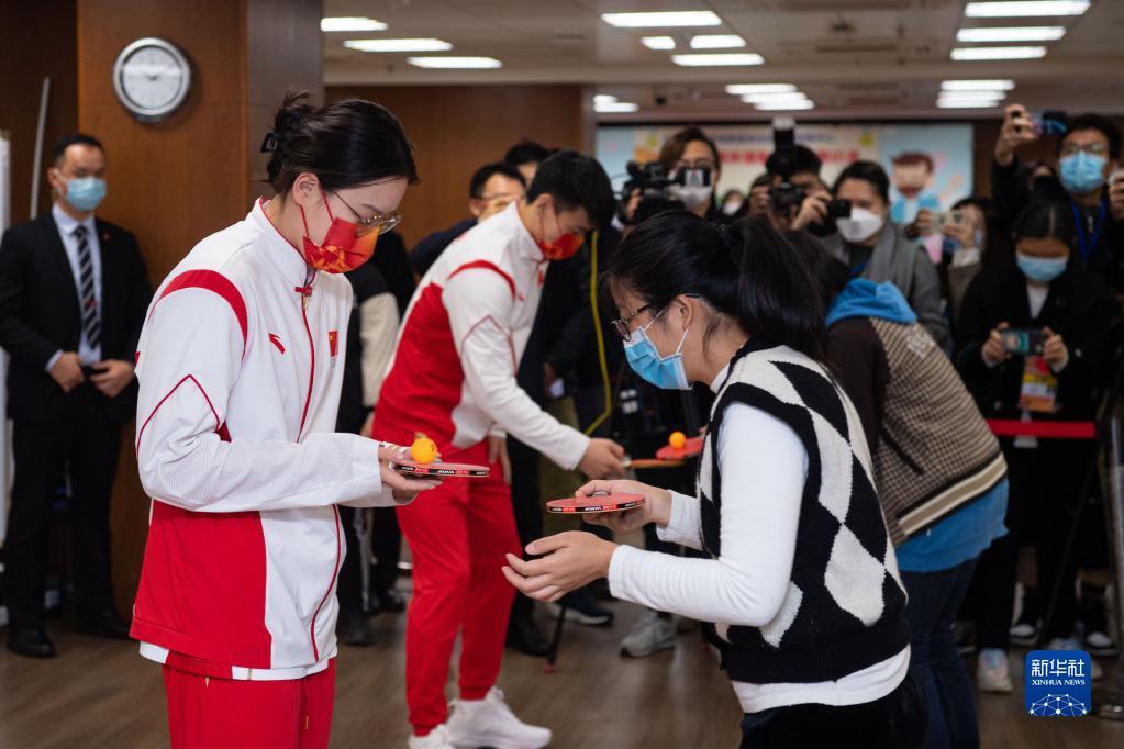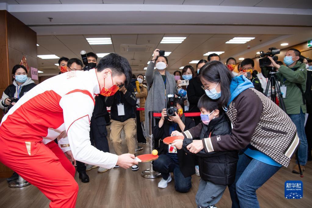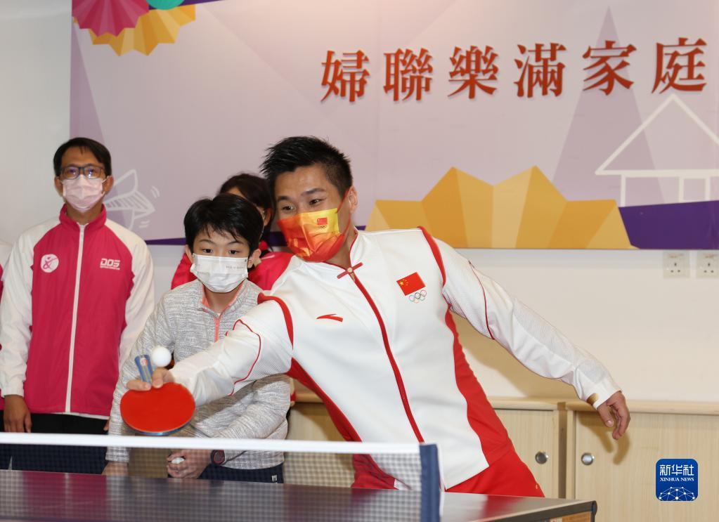 12月21日,在澳门妇联乐满家庭服务中心,内地奥运健儿代表团成员吕小军(右)与社区居民一起打乒乓球。