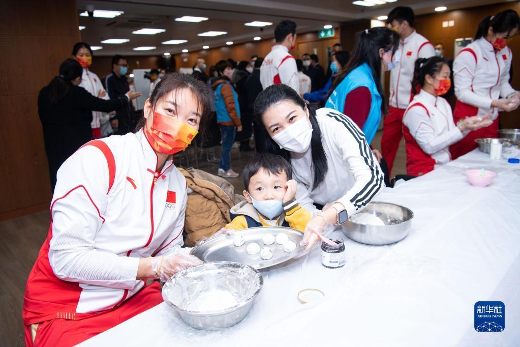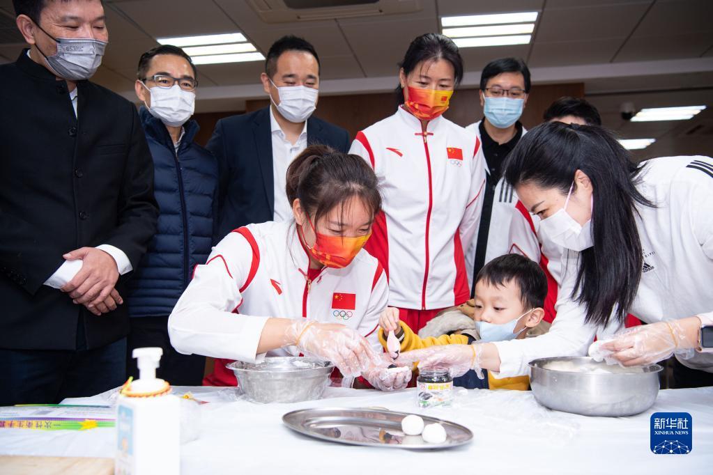 12月21日,在澳门街坊联合总会石排湾家庭及社区综合服务中心,内地奥运健儿代表团成员张灵(前左)与小朋友一起制作汤圆。