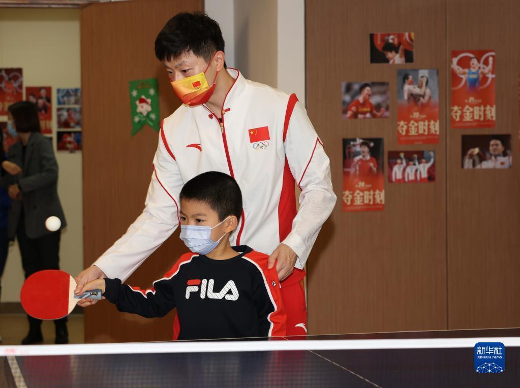 12月21日,在澳门妇联乐满家庭服务中心,内地奥运健儿代表团成员马龙(上)在交流互动活动中教一位小朋友打乒乓球。