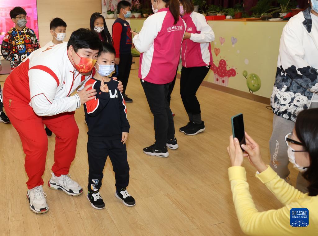 12月21日,在澳门妇联乐满家庭服务中心,内地奥运健儿代表团成员巩立姣(左一)与社区小朋友合影。