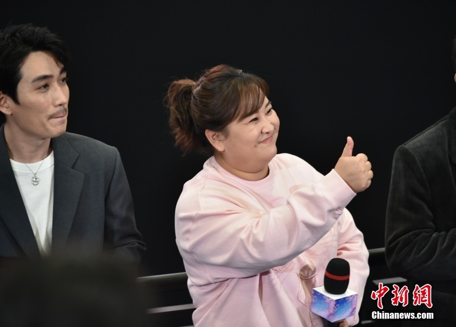 演员贾玲为首先报道影片中原型人物“勇哥”的记者点赞。中新网记者 李骏 摄