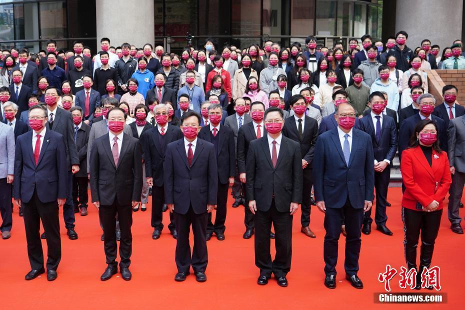 2022年元旦上午,香港理工大学举行升国旗仪式,数百名学校师生和嘉宾出席升旗仪式。图为香港中联办秘书长王松苗(前排左三)、香港特区政府创新及科技局局长薛永恒(前排右三)等主礼嘉宾出席升旗礼。 中新社记者 张炜 摄