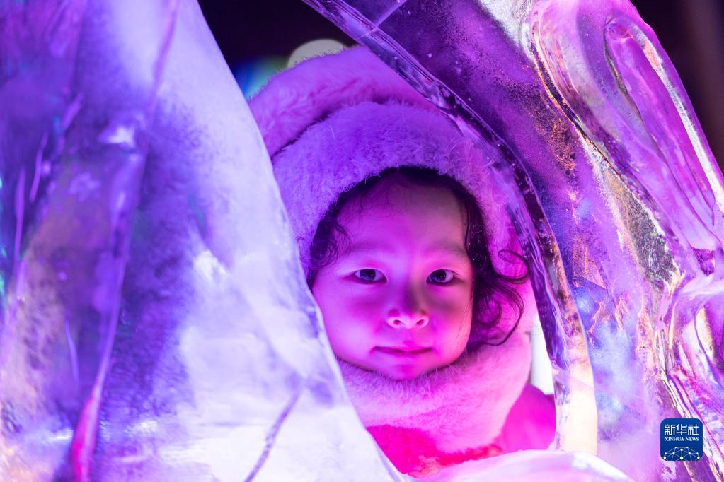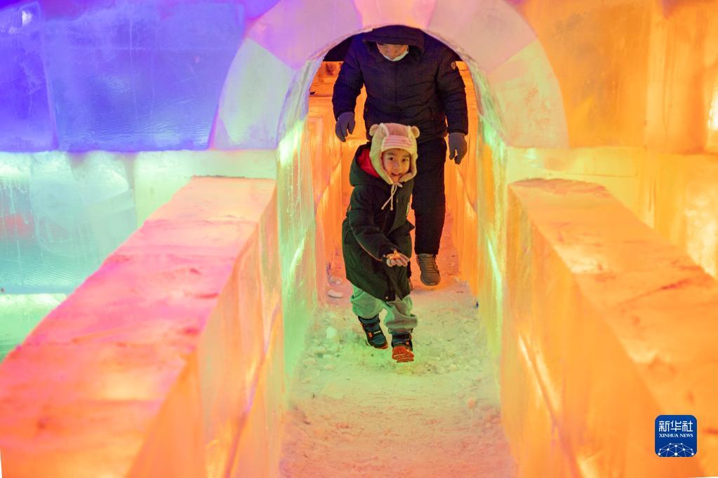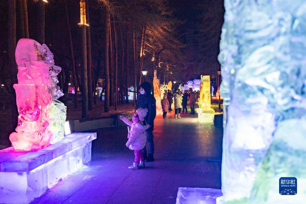 1月5日,游客在哈尔滨冰灯艺术游园会园区内观赏游玩。