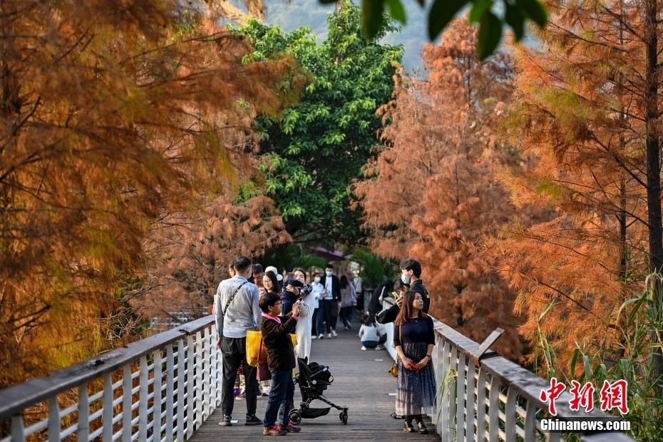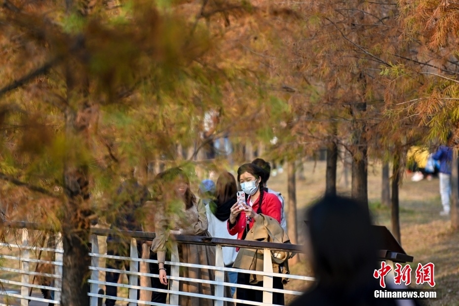 1月8日,广东省广州市,民众在天河湿地公园游玩。近日,天河湿地公园内的落羽杉迎来观赏季。中新社记者 陈骥旻 摄