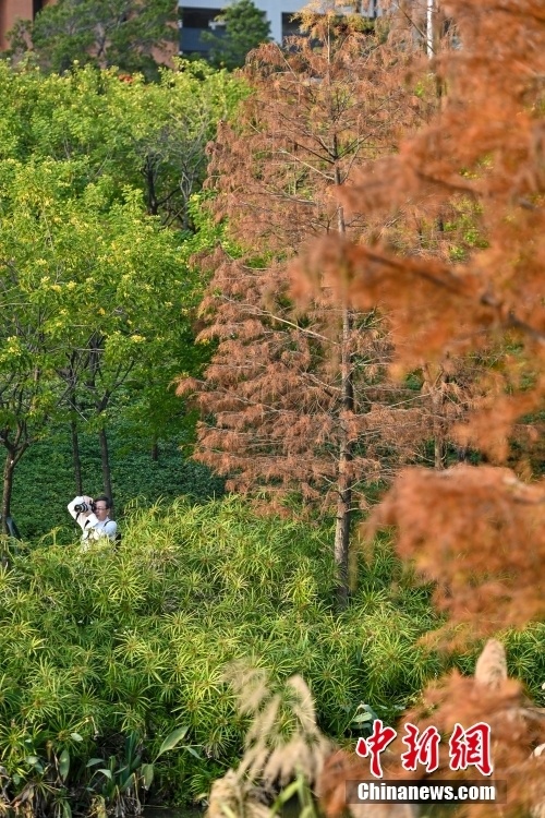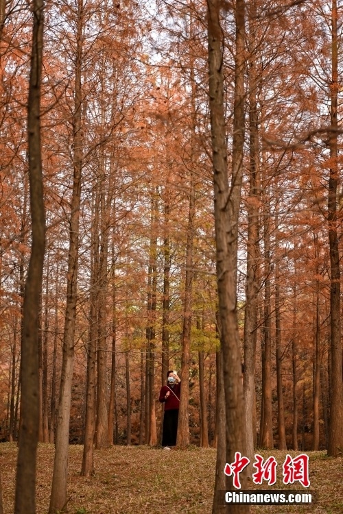 1月8日,广东省广州市,一名游客在天河湿地公园拍摄落羽杉。近日,天河湿地公园内的落羽杉迎来观赏季。中新社记者 陈骥旻 摄