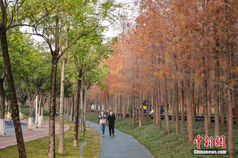 1月8日,广东省广州市,游客在天河湿地公园内漫步。近日,天河湿地公园内的落羽杉迎来观赏季。中新社记者 陈骥旻 摄