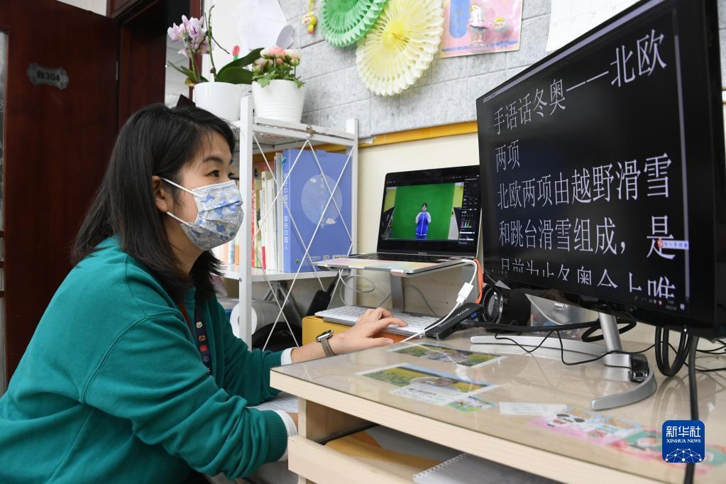 在北京市健翔学校,手语中心负责人刘丹进行校园栏目《手语话冬奥》录制(2022年1月4日摄)。