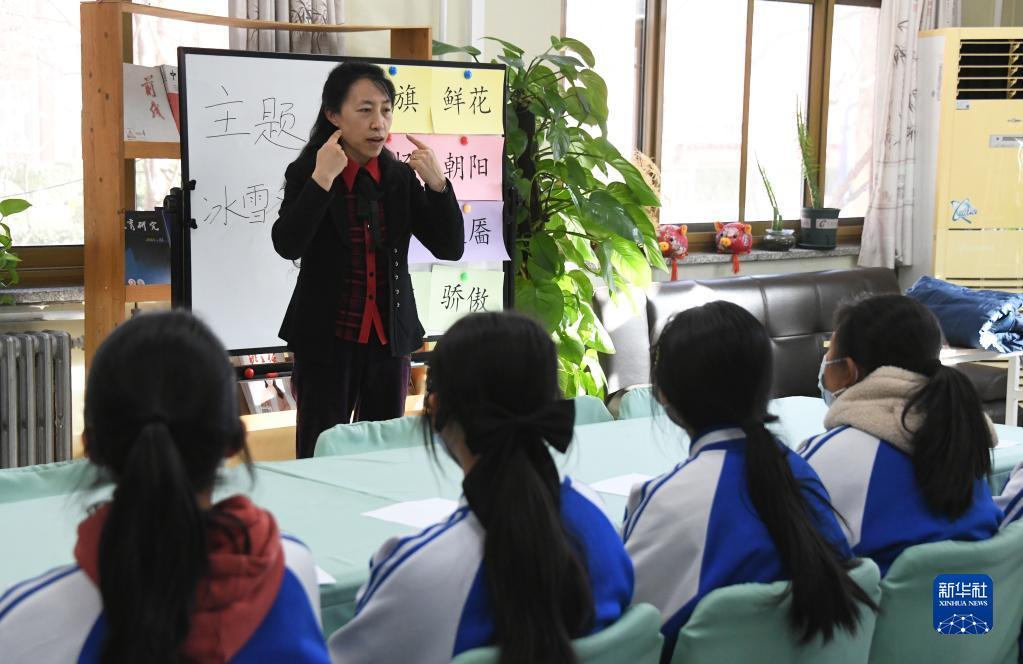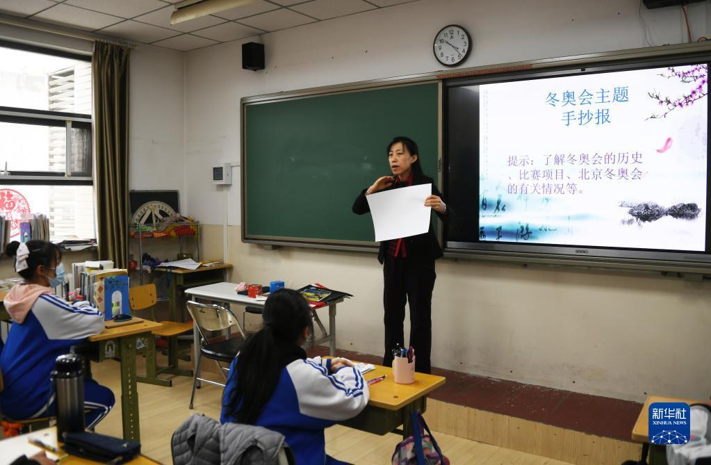 在北京市健翔学校,语文教师郭俊敏为学生们布置寒假作业(2022年1月12日摄)。
