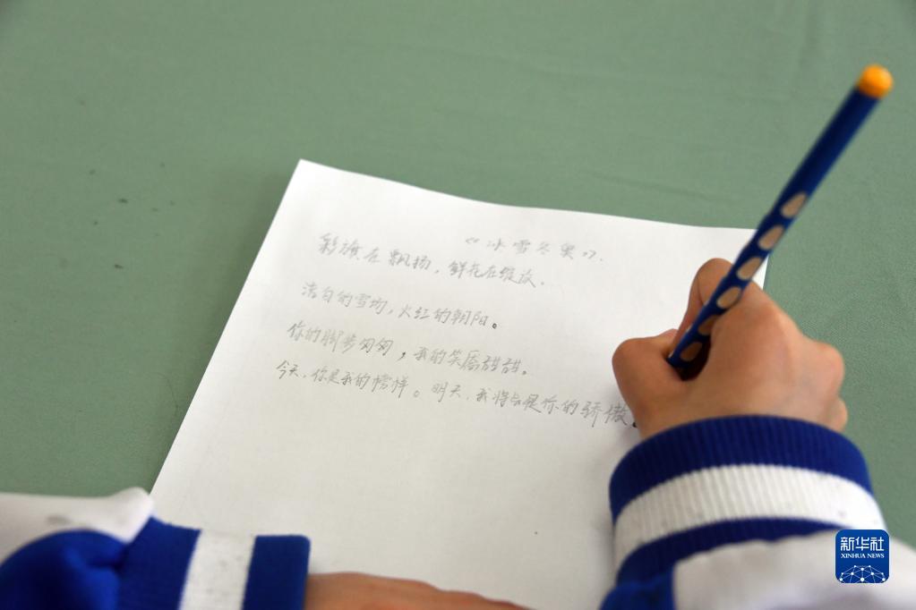 在北京市健翔学校,听障学生潘越铭书写自己参与创作的冬奥主题手语诗(2021年12月30日摄)。