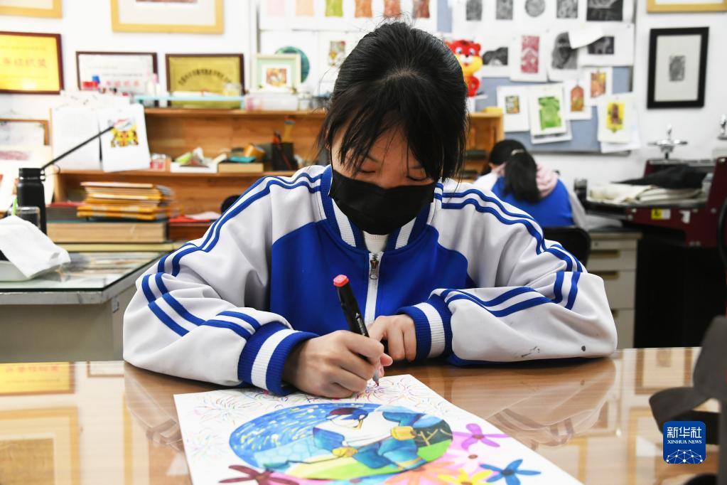 在北京市健翔学校,学生潘越铭创作冬奥主题画(2022年1月4日摄)。