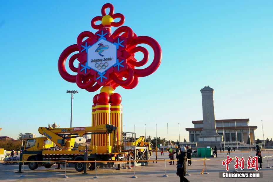 1月13日,北京天安门广场,工人正在搭建安装冬奥景观主题花坛。据悉,北京已全面启动冬奥城市景观布置工作。北京2022年冬奥会举办时正值春节,冬奥城市景观除了营造赛时氛围,还将做好与春节景观布置的衔接。 中新社记者 易海菲 摄