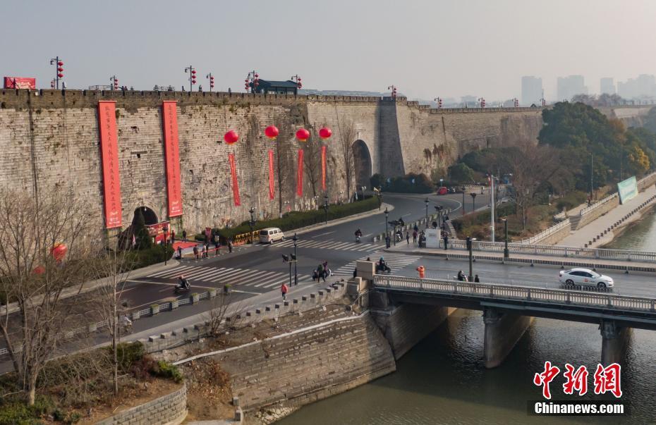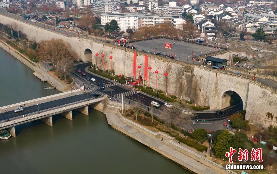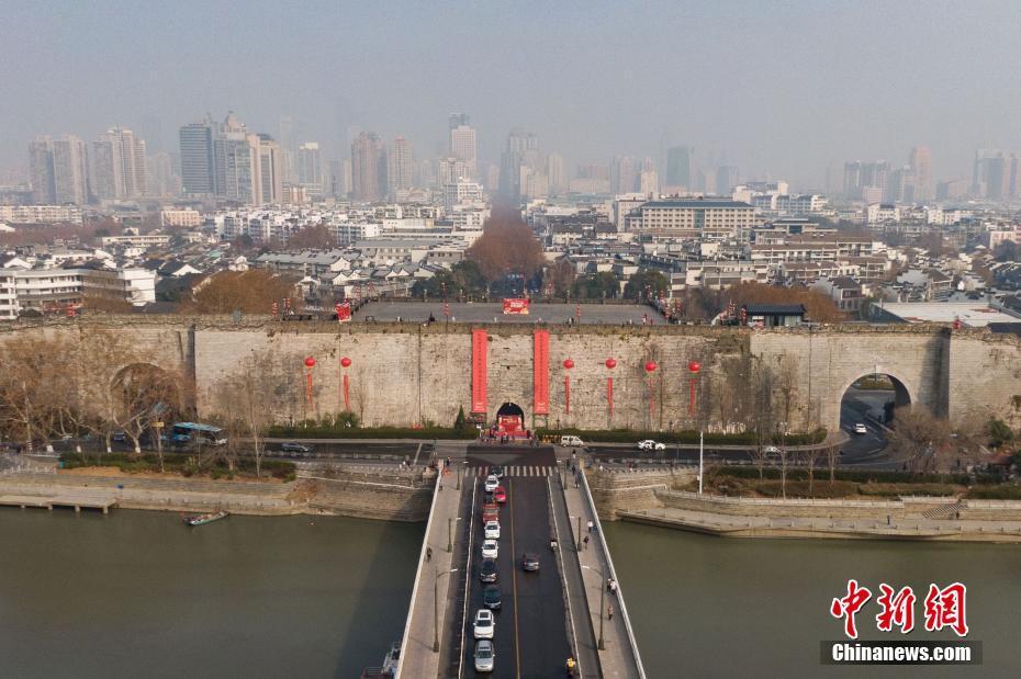 1月16日,航拍挂起春联的南京明城墙中华门。当日,南京明城墙中华门举办“城门挂春联,南京开门红”揭联仪式,长十五米、宽两米的大红春联亮相。据悉,南京中山门、玄武门、解放门、太平门、武定门、集庆门、挹江门等城门挂起的春联也将陆续揭联。(无人机照片) 中新社记者 泱波 摄