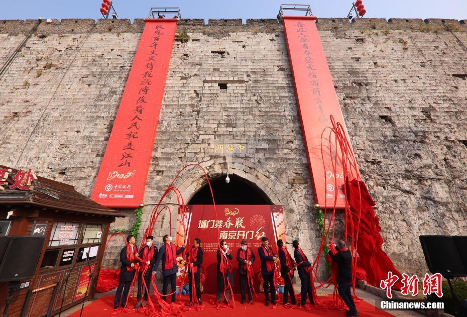 1月16日,南京中华门,嘉宾为巨幅春联揭幕。当日,南京明城墙中华门举办“城门挂春联,南京开门红”揭联仪式,长十五米、宽两米的大红春联亮相。据悉,南京中山门、玄武门、解放门、太平门、武定门、集庆门、挹江门等城门挂起的春联也将陆续揭联。 中新社记者 泱波 摄