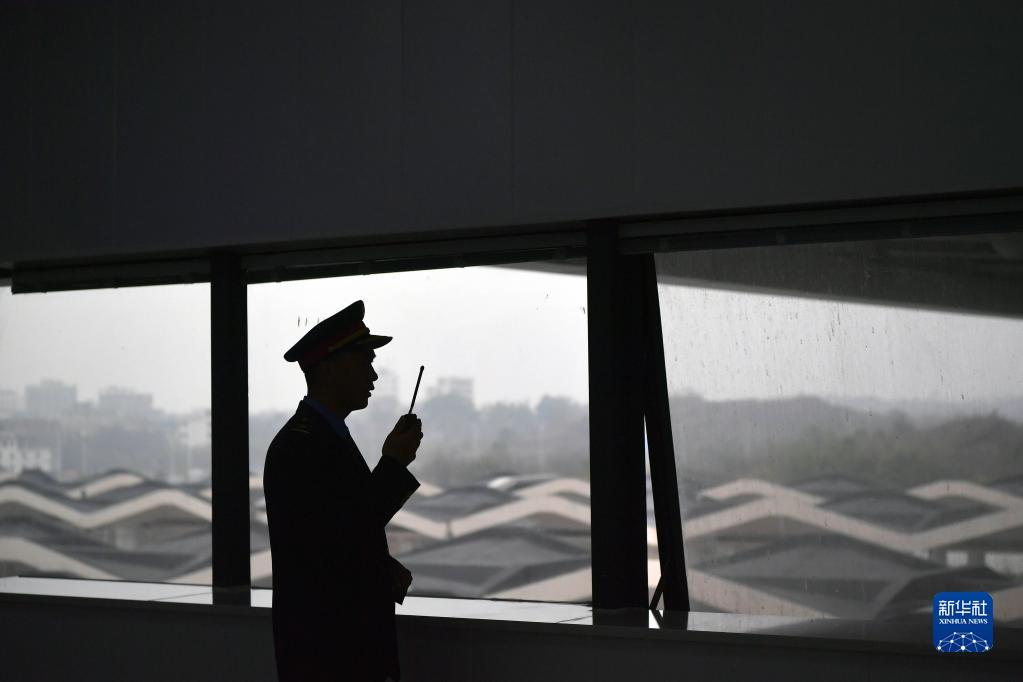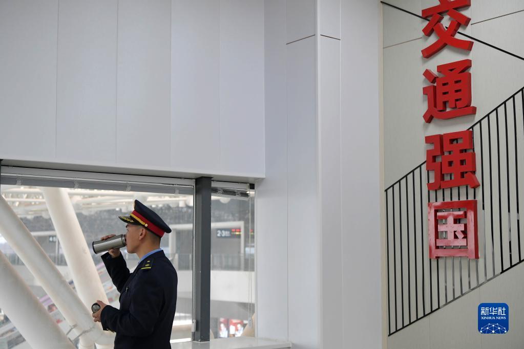 工作间隙,喝杯热水、瞭望站台上来往的高铁列车是张定秀的习惯(1月15日摄)。新华社记者 彭昭之 摄