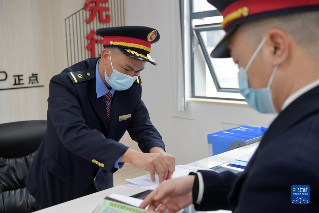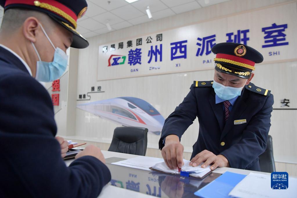在中国铁路南昌局集团有限公司向塘机务段赣州西派班室内,张定秀为即将上岗的高铁司机办理出勤手续(1月15日摄)。新华社记者 彭昭之 摄