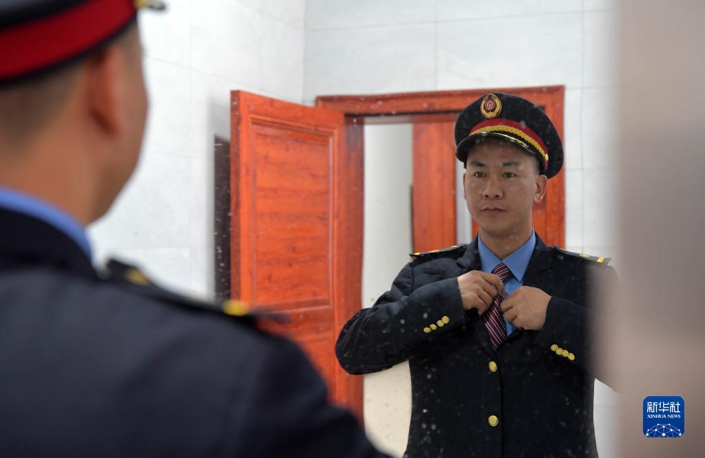 张定秀整理着装准备上岗(1月15日摄)。新华社记者 彭昭之 摄