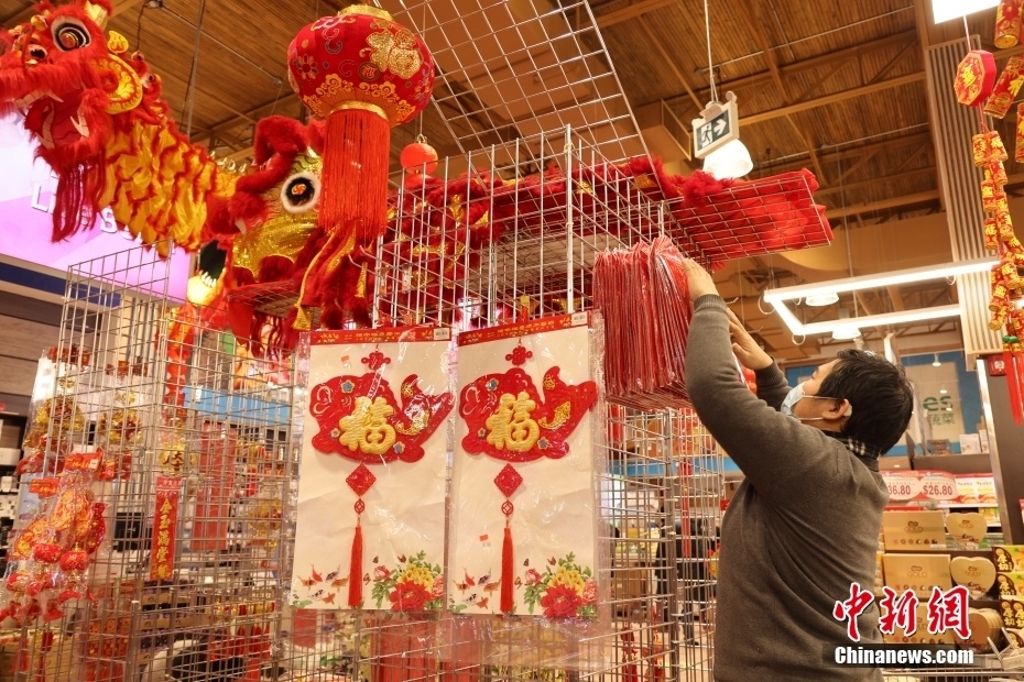 当地时间1月28日,加拿大多伦多一家华人超市的员工正在将年节用品上架。超市正营造浓郁的节日氛围,吸引顾客采购年货,迎接即将到来的壬寅虎年新春。 中新社记者 余瑞冬 摄