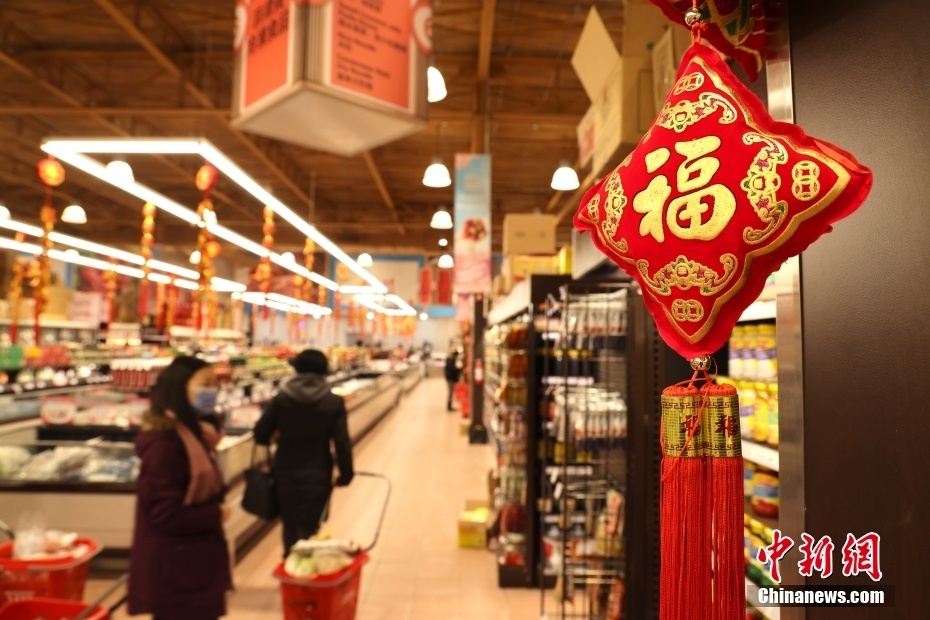 当地时间1月28日,加拿大多伦多一家华人超市挂起“福”字中式挂件,吸引顾客采购年货,迎接即将到来的壬寅虎年新春。 中新社记者 余瑞冬 摄